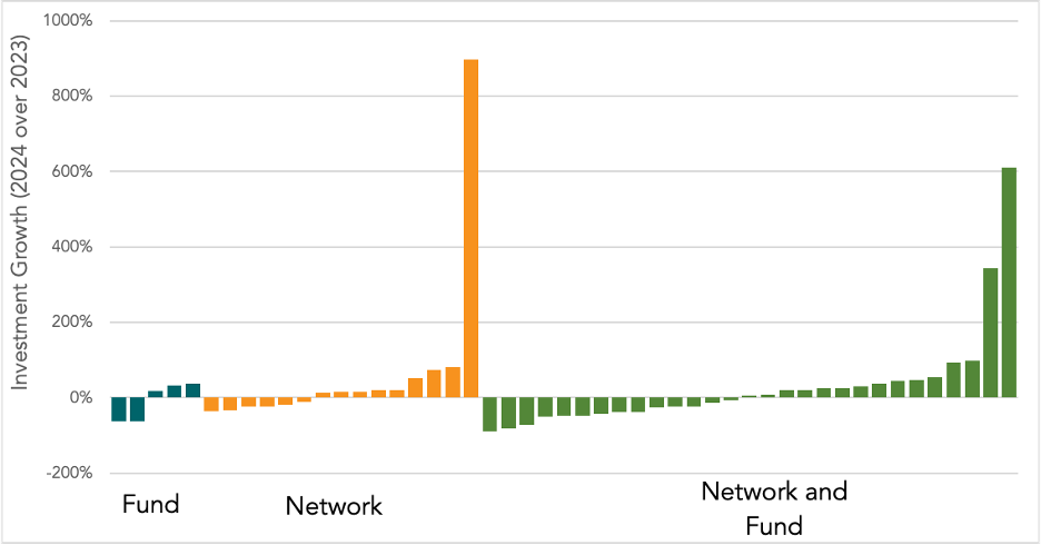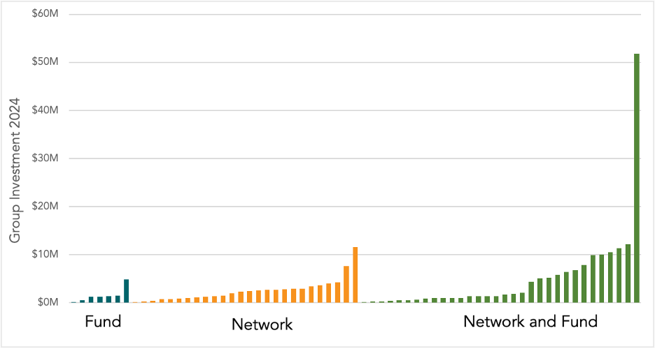 First, we should note that hybrid groups (those that have both direct member investment and investment through funds) have the greatest concentration of large groups (in terms of investment levels). 38% of the hybrid groups are over $5M in investment compared to 8% of the network groups and none of the fund only groups.