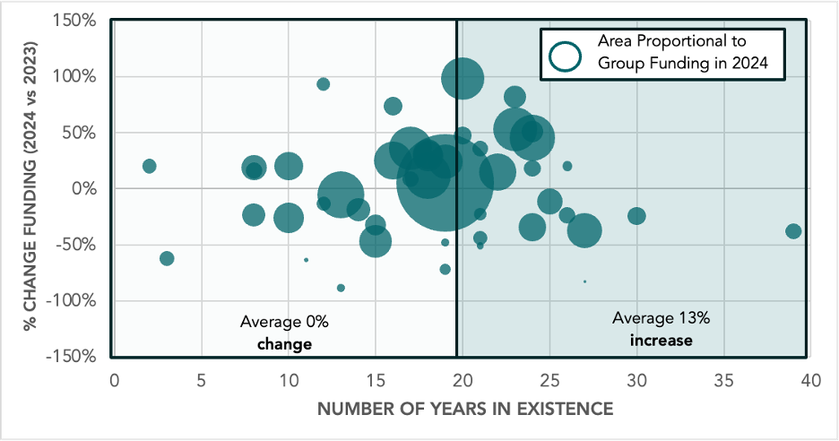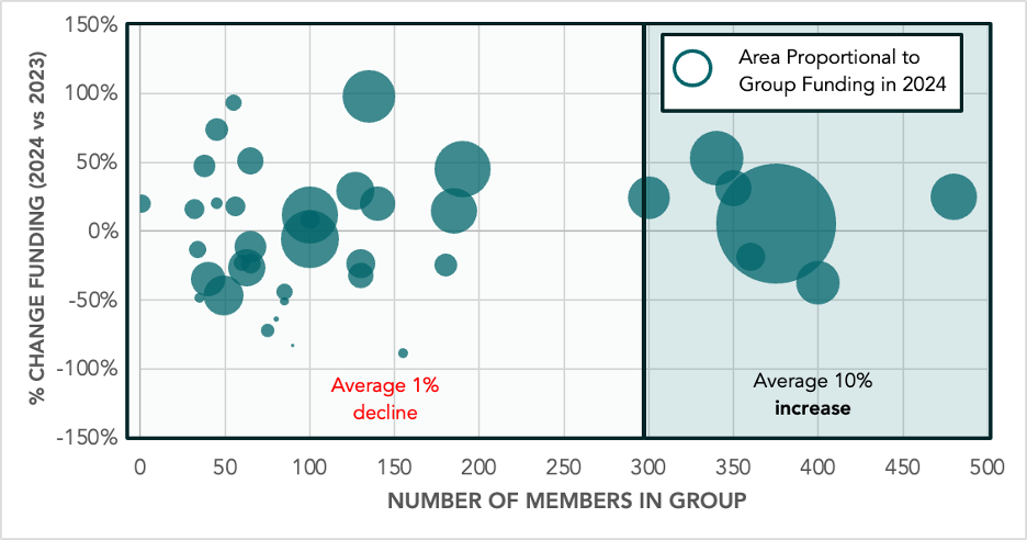While growth rate is higher for larger groups, there is a lot of variation amongst both smaller and larger groups – although the variation is more dramatic for the smaller groups.