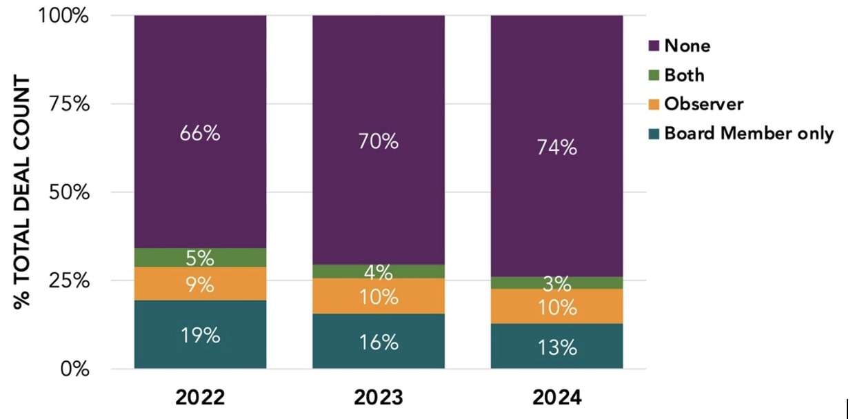 - Despite the demonstrable benefits to investors and management of experienced angel board members, the percentage of deals with board representation has been declining for decades, and has reached an all-time low of 16% in 2024