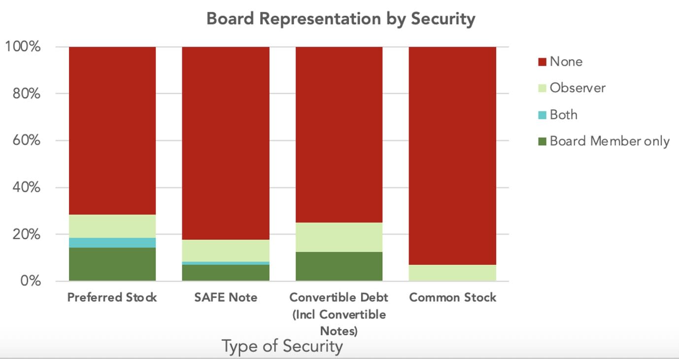 Fourth, there is some evidence that preferred equity deals are more likely to lead to board representation. There are many other arguments for preferring equity to convertible notes and SAFEs, but this is perhaps the most compelling argument: equity provides the best chance of a high value return; SAFEs, the worst chance. There were no instances of board members in common stock deals, and they were most common in preferred equity, followed by convertible notes. Board members were rarer in SAFE notes and investors are often explicitly excluded in the SAFE term sheet from serving on startup boards or having any other role in corporate governance. Therefore, advocating for preferred equity might lead to more board member seats. Since Board representation is highly correlated with higher returns, angels should think carefully about participating in deal structures denying one’s own group or other angels in the syndicate a Board seat. Indeed, deal structures which deny angels any role in company governance preclude angels from providing experienced guidance in any meaningful way, extending a company’s immaturity. A lack of experienced angel Board members is likely a contributing factor to the underperformance of SAFE deals compared to priced equity rounds. And the lack of a Board member representing the angel group or syndicate means that investors are denied access to information critical to deciding whether or not to participate in a follow-on round.
