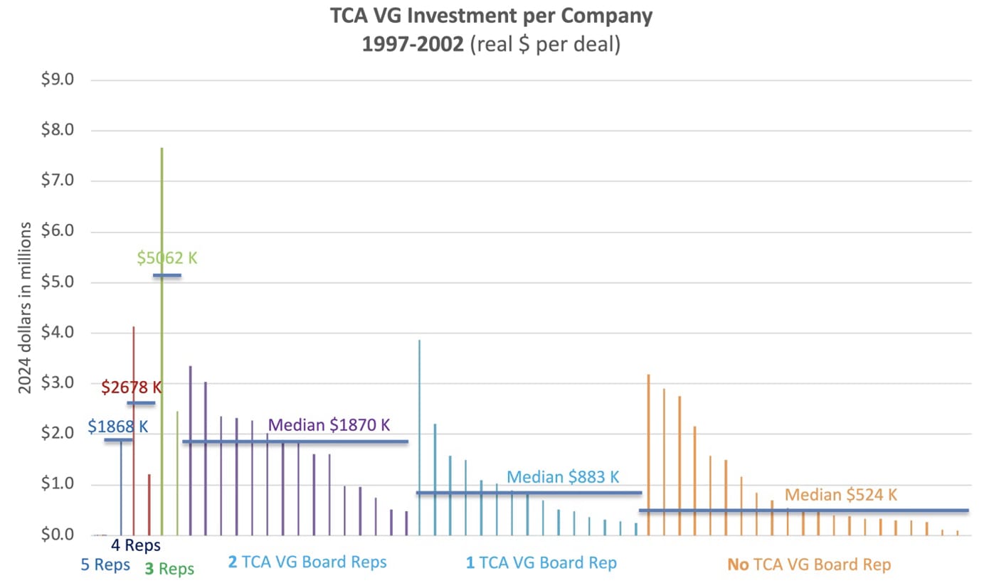 For the recent cohort of companies funded by TCA VG from 2021-2024, the 32% of companies with board representation had a median TCA VG investment of $365k compared to a median of $265k for those without board representation. For this latter cohort, a Board seat appears to have required TCA to invest nearly 40% more than the investment from investors not receiving a Board position.